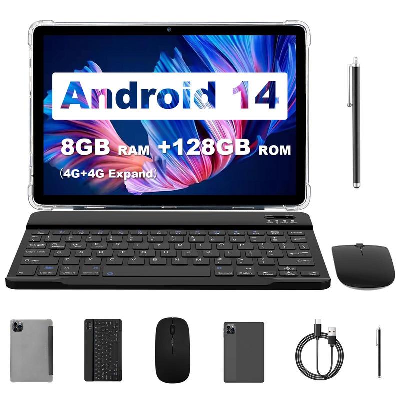 10.1 Inch Android 14 Tablet, 8GB/128GB ROM Tablet with Standable Case & Bluetooth-Compatible Keyboard Mouse Set, Dual Camera Tablet for Home Office